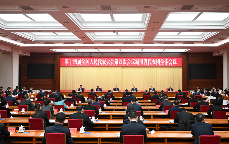 下午,湖南代表团举行分组会议,审议关于政府工作报告、“十五五”规划纲要、年度计划、年度预算等四个决议草案。