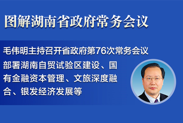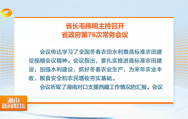 11月17日下午,省长毛伟明主持召开省政府第76次常务会议,传达学习习近平总书记近期重要讲话和指示批示精神,研究部署冬春农业生产、对口援藏、高标准建设湖南自贸试验区、完善省级国有金融资本管理、推进文化和旅游深度融合、促进银发经济发展、支持湘菜创新发展等工...[详细内容]