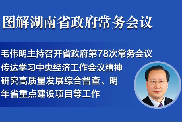 12月14日下午,省长毛伟明主持召开省政府第78次常务会议,传达学习中央经济工作会议精神及习近平总书记近期重要讲话和指示批示精神,研究部署高质量发展综合督查、2026年省重点建设项目、立法工作、长株潭要素市场化配置综合改革试点、江河湖库保护利用、突发事件总体...[详细内容]