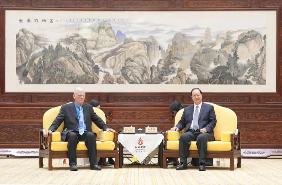 毛伟明对客人的到来表示欢迎并简要介绍湖南与德国交往合作情况。他说,德国是湖南在欧洲的第一大贸易伙伴和技术合作伙伴,近年来,双方认真落实两国领导人重要共识,经贸往来稳步增长、科创合作成果丰硕、人文交流日趋活跃,尤其是双方在机械制造、汽车零配件、新材料等领域合作日益紧密。目前,大众、博世、巴斯夫等38家德资企业在湖南落地生根,中联重科、三一重工、中车株机等湘企在德投资发展;湖南设立“德国中小企业总部集聚区”,成功引进一批德企中国总部落户。今年一季度,湖南对德国进出口总额同比增长54.8%。毛伟明表示,希望德国环球之桥协会和中国人民外交学会充分发挥平台、人才和资源优势,助力湖南与德国进一步深化经贸合作、加强科创协同、拓展人文交流,实现互利共赢。