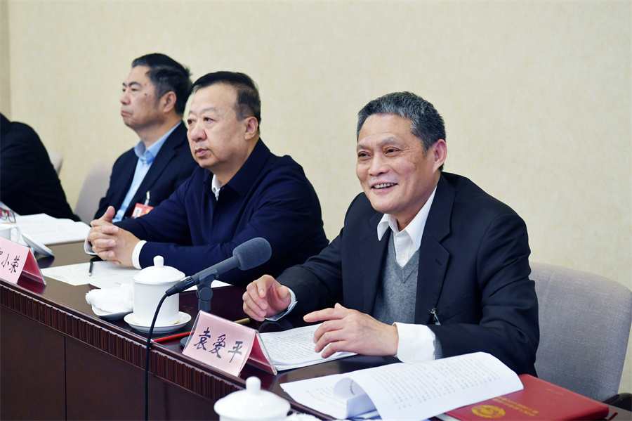 3月5日,住湘全国政协委员袁爱平(右一)在小组会议上发言。