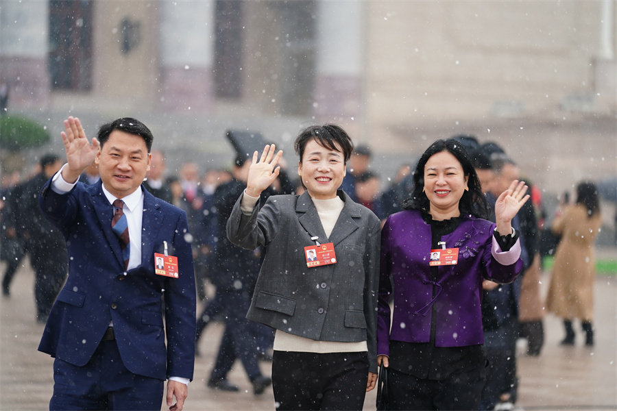 3月4日上午,瑞雪飞扬。十四届全国人大四次会议预备会议结束后,湖南代表团代表走出会场。他们对本次盛会满怀期待。
