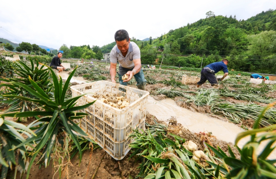 6月22日,龙山县石牌镇上母村,农民在抢收百合。近日,龙山县普降暴雨,全县不同程度受灾。洪水退去后,当地农民纷纷抢收抢种,进行生产自救。 曾祥辉 摄(湖南图片库)