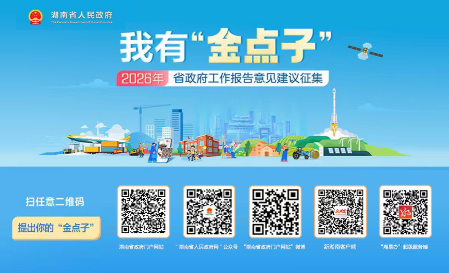 在2026年湖南省两会即将召开之际,为更好听民意知民愿聚众智,绘就三湘发展“同心圆”,做好2026年省政府工作报告起草工作,即日起至2026年省两会前,省政府门户网站联合多家媒体与各市州、省直部门政府网站和政务新媒体以及“湘易办”超级服务端,举办省政府工作报告“金点子”征集活动。