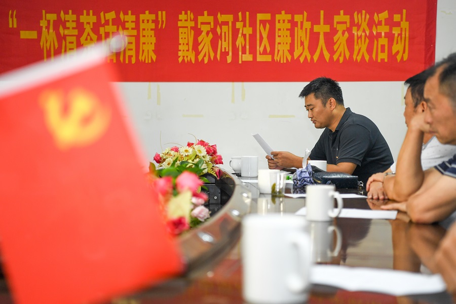 8月27日,长沙市开福区秀峰街道戴家河社区,社区党员共同学习“中央八项规定、六项禁令”。
