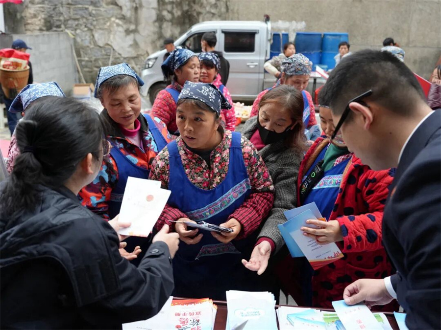 当日,默戎镇恰逢赶集日,“学习宣传贯彻习近平法治思想,推动宪法深入人心”的宣传横幅在摊位间格外醒目。宣讲团成员通过设置咨询台、摆放图文展板、发放宣传手册等形式,向过往群众普及《宪法》《未成年人保护法》《反有组织犯罪法》等方面的法律知识。考虑到当地苗族群众聚居的特点,检察官们灵活运用苗语和方言,将抽象的法律条文转化为婚姻家庭、权益保障、邻里纠纷等群众关心的生活道理,耐心解答大家的法律疑问。