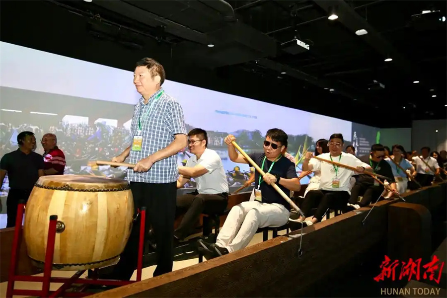 鼓点激荡,数字龙舟破浪前行。在怀化五溪非遗园内的燕尾龙舟体验厅,10多位海外华文媒体记者齐划船桨,巨型屏幕上龙舟疾驰过沅水。