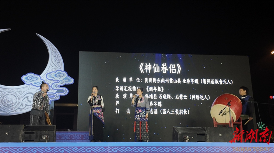 舞台上,来自贵州的苗族音乐人金春冬蝶与本地“三蛮乐队”的村长以及网络达人石紫云、石晓梅共同参与的《神仙眷侣》,大胆地将苗歌的旋律与现代编曲相融合,古老的歌谣在芦笙和打击乐的衬托下,生出别样的时尚枝桠。