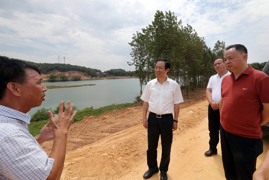 许达哲察看洣水河干堤,了解防汛工作情况。