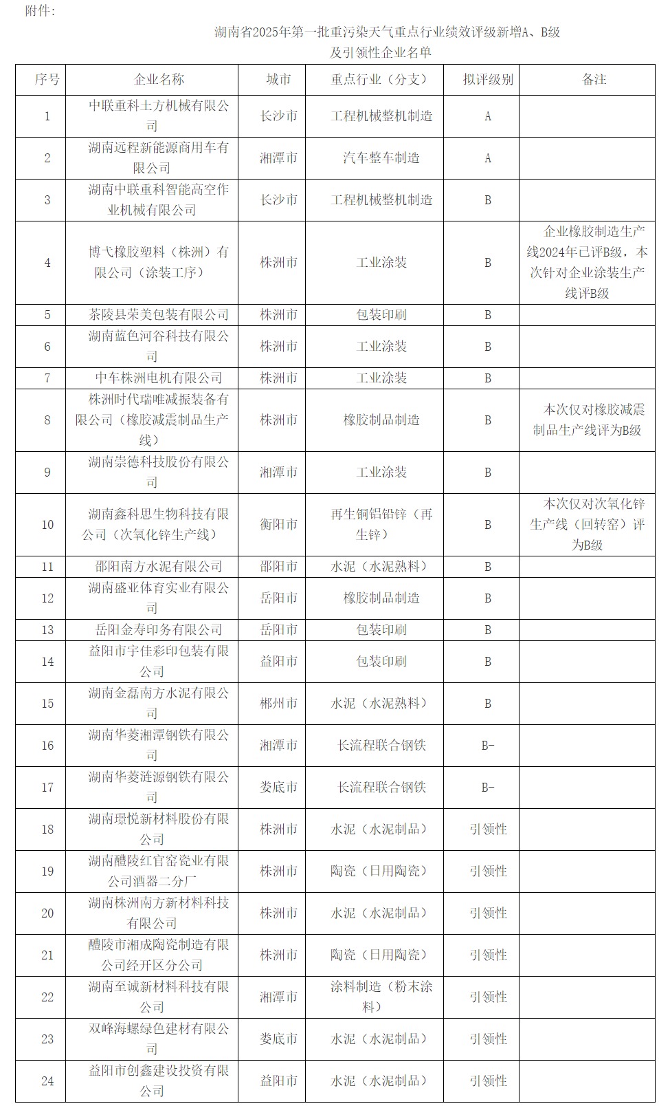 附件:湖南省2025年第一批重污染天气重点行业绩效评级新增A、B级及引领性企业名单