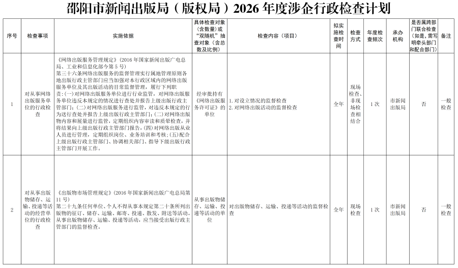 邵阳市新闻出版局(版权局)2026年度涉企行政检查计划